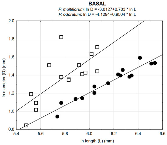 Relationships between diameter and length for all three regions of the shoot for the two species P. odoratum and P. multiflorum.