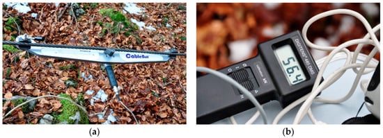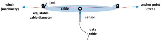 In principle, tensile forces of cables can be directly measured in-line by installing load cells, dynamometers, or sheave pins between the cable and anchor, or indirectly via clamp-on devices using the linear relationship between the deflection in a cable and the resulting force on the central member [24]. During this study, we measured the tensile forces of the cable during operation with the CableBull cable tensile force measurement device from the German manufacturer Honigmann, based on the clamped-on tension monitoring system that measures the resulting forces on the central member for a given deflection (Figure 2).