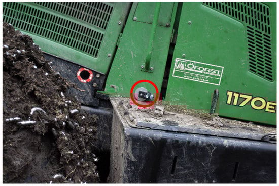 Machine inclination was recorded with the Hobo Pendant G Acceleration Data Logger. The logger uses an internal three-axis accelerometer for measuring the dynamic and static acceleration of gravity in order to record and analyse machine inclination. The sensor was fixed on the rear of the machine’s frame to measure machine inclination during operation (Figure 4). The data were stored on the data logger and read out with the corresponding HOBOware software from ONSET® in Bourne, MA, USA. Exported as a text file, the inclination over time can be used for detailed analysis. The data were transformed from degrees into a percentage after being read out. In this study, the sample rate for recording machine inclination was set to 0.03 Hz due to the data storage space required for long-term recording.