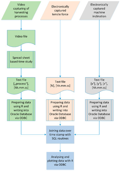 The developed workflow for preparing data from the time study, the tensile force measurements, and from the sensor recording machine inclination for writing via an Open Database Connectivity (ODBC) into the database and joined using the time stamps for further analysis. SQL: structured query language.