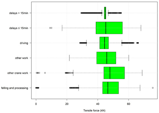 The box plots clearly indicate that the pre-set tensile force that is chosen from the driver ranges from 40 to 60 kN and is set and changed constantly by the driver according to the need during operation (Figure 7). Overall, most of the activities used a working cable load of between 20% and 30% (Figure 8).