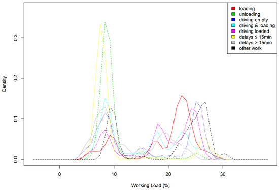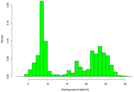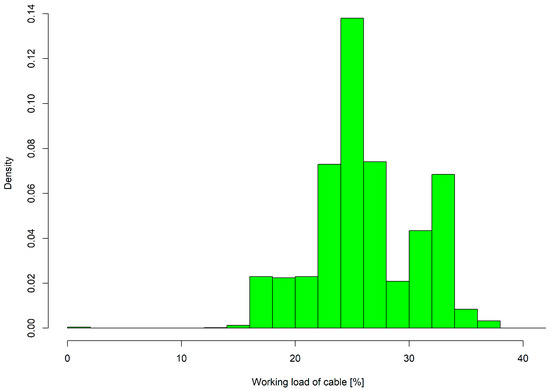 The working load on the cable did not exceed one-third of the maximum breaking strength during the entire study, and was most often between 5% and 11% and 22% and 28%. Analysing the density in terms of the workload based on the defined work phases showed that the majority of low working load was due to delays up to 15 min and the unloading phase. Higher working loads on the cable occurred during loading and driving activities and phases of other work (Figure 10 and Figure 11).