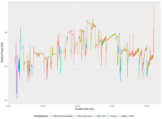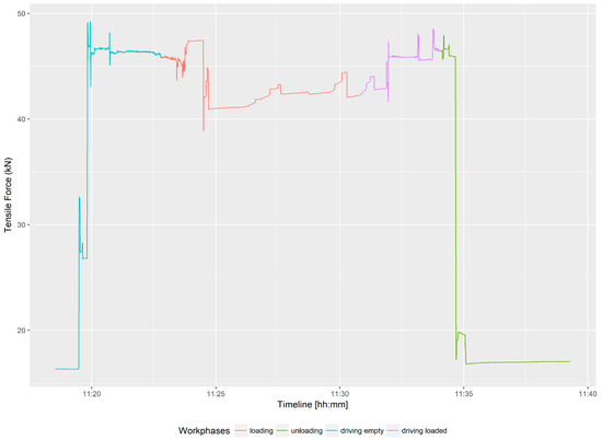 Tensile force graph showing the defined work phases of the observed harvester for a selected time period.