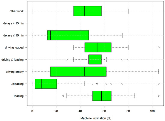 The recorded machine inclination for the forwarder during the study for a selected time period. Each box plot contains whiskers including data from 2.5% to 97.5%, boxes from 25% to 75%, and the black line denotes the median. Outliers are marked as points.