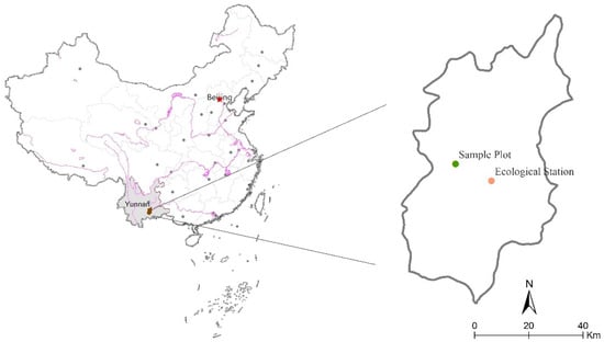 This study was conducted at the Desert Ecological Research Station in Jianshui County (102°54′ E, 23°37′ N), Yunnan Province, southwest China (Figure 1). The site has a typical subtropical monsoon climate with distinct warm-wet (May to October, about 85% of annual precipitation) and cool-dry seasons (November to April, about 15% of annual precipitation). The area has a mean annual precipitation of 805 mm and mean annual temperature of 19.8 °C. The average annual evaporation capacity is 2296.5 mm. As typical for karst ecosystems, the calcareous soil developed from a limestone base. Vegetation and soil degradation are serious due to anthropogenic disturbances, which have resulted in large areas of bare lands in this region. Since the 1990s, PY and EM plantations have been used to reforest the degraded ecosystem.