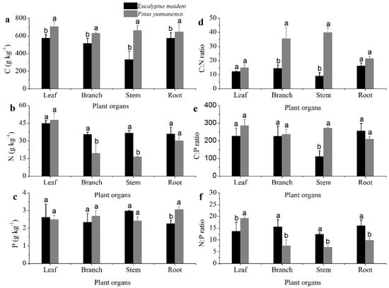 The stoichiometric characteristics of the C, N, and P concentrations of different plant organs. The (a–f) are represent C, N, P concentrations and the tatios of C:N, C:P and N:P, respectively. The error bars represent the standard error. The different letters indicate a significant difference of the means from each plant organ from the two plantations based on ANOVA (Analysis of Variance) and LSD (Least Significant Difference) tests (p < 0.05).