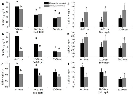 The stoichiometric characteristics of soil C, N, and P. The error bars represent the standard error. The (a–f) are represent C, N, P concentrations and the tatios of C:N, C:P and N:P, respectively. The different letters indicate a significant difference of the means at each soil depth in the two plantations based on ANOVA and LSD tests (p < 0.05).