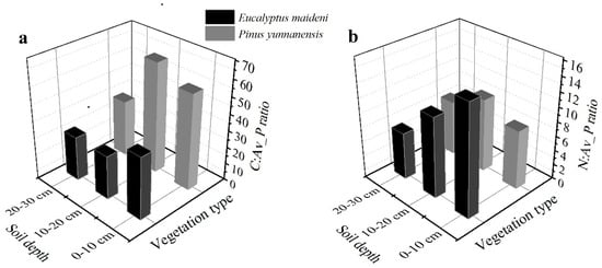 In the EM plantation, the available P (Av_P) concentrations varied between 0.973 g/kg and 1.626 g/kg, with a mean of 1.244 g/kg, and in the PY plantation, the available P concentrations varied between 0.667 g/kg and 1.013 g/kg, with a mean of 0.893 g/kg (Table 2). Both the ratios of C:Av_P and N:Av_P in the EM plantation in the soil profiles decreased slightly with the depth of the soil, but in the PY plantation, an increase and then decrease was observed with the soil depth. The average ratio of C:Av_P is much higher in the PY plantation, and N:Av_P is much higher in the EM plantation (Figure 4).