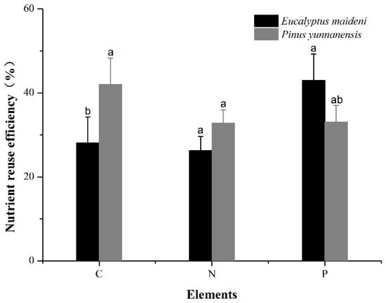 The NRE-P was higher than NRE-N, which indicated the deficiency of P in soils of low latitude regions, or differences in the relative amounts of nutrients that were leached from the leaves. Thus, the high resorption rates of P could have favored moderating P deficiency in the karst ecosystem [,]. This finding is inconsistent with previous research that reported a negative response of nutrient resorption and conservation by plants to the availability of a limiting nutrient []. The C:N:P ratios in the senesced leaves of the two plantations were also different (Figure 6). The N:P ratio was higher in senesced leaves, suggesting that PY and EM plantations are more P limited. This also indicates a stronger tendency for the resorption of P relative to N in the karst ecosystem. The high C:P ratio but low C:N ratio in the two plantations implies more efficient use of C and P than N, which reflects the adaptation of plants to low P habitats (Figure 6).