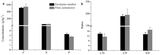 Plant organs contain various elements, and the contents of these elements affect the growth of plants []. The C, N, and P concentrations were different among the plant organs from Pinus yunnanensis and Eucalyptus (Figure 2a–c). In PY and EM plantations, the leaf C concentrations were 707.22 g/kg and 572.97 g/kg, and the leaf N concentrations were 47.87 g/kg and 45.04 g/kg, respectively (Figure 2a,b). The leaf C and N concentrations were much higher than what has been previously found in other studies at the same latitude, where C concentrations in PY and EM plantations were 509.25 g/kg and 462.45 g/kg, and leaf N concentrations were 11.24 g/kg and 18.03 g/kg, respectively [,,]. Conifer needles have a large number of C-rich compounds such as resins, tannins, and waxes, which could contribute to the higher C content []. Plants in subtropical areas with high temperatures, sunlight, and precipitation have the ability to undergo cell division and require proteins involved in photosynthesis, resulting in relatively high N in leaves [,]. In PY and EM plantations, the P concentrations in leaves were 2.49 g/kg and 2.61 g/kg, respectively. This is higher than what was found in previous studies, where the P concentrations were 0.82 g/kg and 1.33 g/kg, respectively [,]. The dominant tree species in our research were significantly higher than that of the mean leaf P in terrestrial ecosystems (1.99 g/kg), and the P concentration in EM was higher than in the PY plantation [,]. Our research supported a previous study that suggested that plants with high relative growth rates generally have high leaf P concentrations, as they must have high metabolic rates to support the energy demands of macromolecular synthesis []. A previous study also argued that low leaf P in plants is indicative of low protein content and slow growth, which also would account for recalcitrant litter []. The concentrations of C, N, and P in leaves and needles are higher in karst landscapes, indicating that Eucalyptus and P. yunnanensis had a more conservative use of nutrients to cope with the harsh environment (e.g., low water retention capacity and soil nutrients), helping plants to gain a competitive advantage in barren soils [,,,].