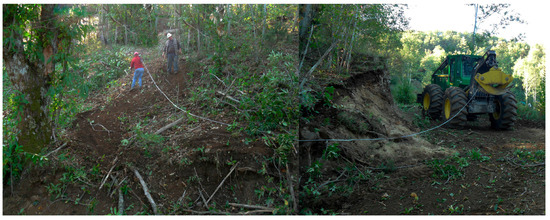 The time study data were collected during the autumn of 2016 and the spring of 2017. At both sites, the work system adopted was the Full Tree System (F.T.S.). At site A, the working group consisted of one skidder operator, two choker setters and one operator at the landing site. The operator drove the skidder from the roadside to the felling site, then released the cable for hooking (Figure 2). Loads were attached to the cable by the choker setters, winched to the skid trails, and extracted to the landing area by the skidder. In contrast, at site B, the crew consisted only of two workers: a skidder operator (same as the skidder operator working at site A), who used a skidding grapple to drag the trees to the landing area where the second operator awaited the load.