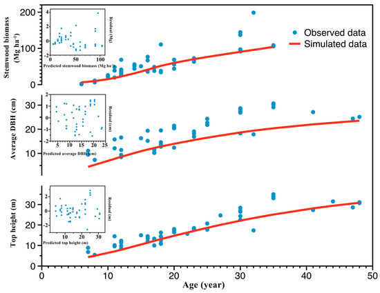 FORECAST predictions (solid lines) and field data obtained for Metasequoia glyptostroboides plantations (dots) for stemwood biomass (top panel), average DBH (medium panel), and dominant top height (bottom panel). Residuals for the linear regression of observed vs. predicted data are in the small panel for each variable. DBH = diameter at breast height.