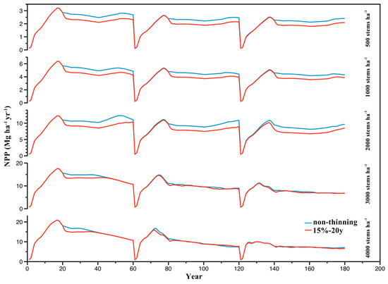 Changes in net primary productivity (NPP) in stands with different initial densities in three rotations. Blue lines represent non-thinning, red lines represent 15% thinning intensity and 20th year of application of thinning in a rotation.