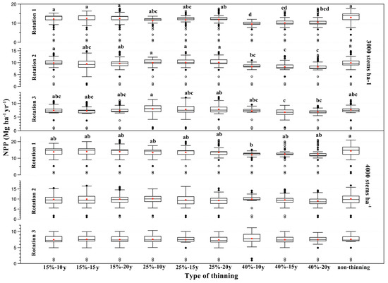 Distribution of simulated NPP in different rotations and stand densities for different thinning types. The red dot indicates the average NPP. Different letters indicate significant differences between thinning types with Tukey HSD (honest significant difference) test at p < 0.05.