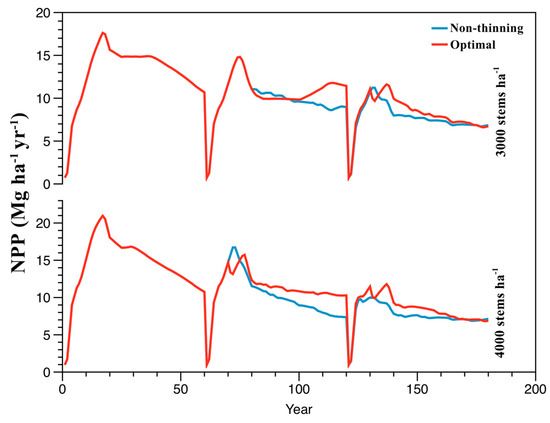 NPP in stands with different initial stand densities in three rotations. Blue lines represent non-thinning, red lines represent optimal treatments. For the 3000 stems ha−1 stands, 25% thinning intensity and application of thinning in the 20th year occurred in Rotation 2 and 25% thinning intensity and application of thinning in the 10th year occurred in Rotation 3. For the 4000 stems ha−1 stands, 25% thinning intensity and application of thinning in the 10th year occurred in Rotation 2 and 40% thinning intensity and application of thinning in the 10th year occurred in Rotation 3.