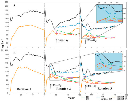 Change in ecological variables in stands with different initial densities in 180 years of simulation under different thinning treatments and non-thinning. Panel A: 3000 stems ha−1, Panel B: 4000 stems ha−1, TD—total demand N; TU—total uptake N; TA—total available N in soil; optimal-TD—total demand N under optimal treatments; optimal-TU—total uptake N under optimal treatments; optimal-TA—total available N under optimal treatments.