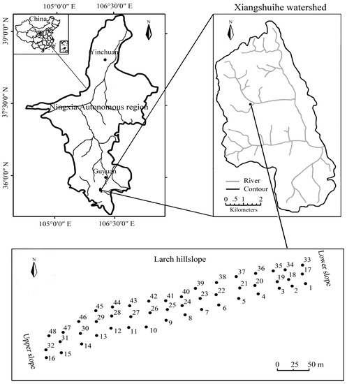 The study was conducted in the small watershed of Xiangshuihe (XSH, 106°12′–106°16′ E, 35°27′–35°33′ N) in the LPM area, Ningxia Hui Autonomous Region, northwest China (Figure 1). XSH has an area of 43.7 km2, an elevation range of 2010–2942 m above sea level (a.s.l.), a temperate semi-humid climate with mean air temperature of 6.0 °C and mean annual precipitation of 632 mm. The main vegetation types are natural secondary forests and plantations. The natural secondary forests mainly consist of Pinus armandii Franch, Betula platyphylla Suk., Betula albosinensis Burk., and Quercus liaotungensis Koidz. The plantations consist mainly of Larix principis-rupprechtii, which accounts for 90% of the total plantation area, and a small portion of Pinus tabuliformis Carrière.