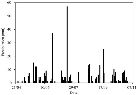 Polycarbonate tubes were installed at 48 points to monitor soil moisture along the hillslope. The distance between the upper and lower adjacent tubes was about 30 m, and the distance between the neighboring tubes at the same level was about 15 m (Figure 1). The volumetric soil moisture (VSM) within the root zone (0–60 cm) at each point was monitored at a space interval of 20 cm and a time interval of about 15 days, using a time domain reflectometry (TDR) portable soil moisture measuring instrument (TRIME-PICO-IPH, Ettlingen, Germany). The VSM data of totally 13 observation days were collected from May to October in 2016. According to Brocca et al. [34], generally 12 sampling occasions are required to determine the most time-stable locations (MTSLs). Thus, the 13 sampling times in our study should be considered sufficient for analyzing the temporal stability of VSM. The weather conditions were monitored using an automatic weather station (WeatherHawk 232, WeatherHawk, Logan, Utah) about 100 m away from the slope foot at the relatively open site of the valley. The daily precipitation distribution during the study period is shown in Figure 2.