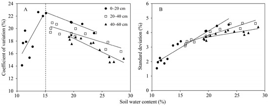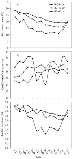 The temporal variation and descriptive statistics of standard deviation (SD) and coefficient of variation (CV) at different soil layers are shown in Figure 3B,C. The temporal variability of SDs were 35.95%, 14.41%, and 7.03%, and the temporal variability of CVs were 14.08%, 7.38%, and 9.37%, at the soil layers of 0–20, 20–40, and 40–60 cm, respectively (Table 2). This indicated a higher spatial variability of VSM over time in the surface soil (0–20 cm) than deep soil (20–40 and 40–60 cm). The variation range of CVs during the study period was 14.11–22.63%, 16.31–20.92%, and 14.63–18.98% in the 0–20, 20–40, and 40–60 cm soil layers, respectively; all display moderate variability according to the variability degree (low (CV < 10%), moderate (10% ≤ CV ≤ 100%), and high (CV > 100%)) defined by Nielsen and Bouma [38].