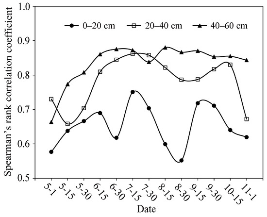 The temporal stability of the spatial patterns of VSM was determined based on the Spearman’s rank correlation coefficients (rs) between different sampling dates. The spatial patterns of VSM at different sampling dates were all significantly correlated (p < 0.05), and all the average rank correlation coefficients of VSM corresponding to different time lags at three different depths are greater than 0.5 (Figure 5), indicating a strong temporal persistence of the spatial distribution of VSM in various depths. The temporal stability of the spatial distribution of VSM increased with rising soil depth, with the mean rs values over the study period of 0.65, 0.78, and 0.84 for the 0–20, 20–40, and 40–60 cm soil layers, respectively. A one-way ANOVA showed that the mean rs among the three soil depths were significantly different (p < 0.01).