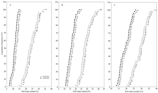 The cumulative frequency of 48 points at the two days with maximum and minimum VSM in the soil layers of 0–20 cm (A), 20–40 cm (B), and 40–60 cm (C).