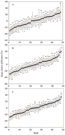 Ranked mean relative difference (MRD) of VSM of 48 points with standard deviations (SDRD) at the soil layers of 0–20 cm (A), 20–40 cm (B), and 40–60 cm (C).