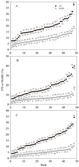 Ranked index of time stability (ITS) and mean absolute bias error (MABE) in the soil layers of 0–20 cm (A), 20–40 cm (B), and 40–60 cm (C).