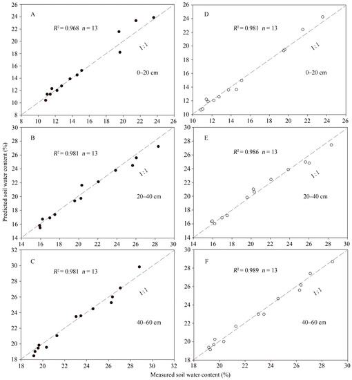 According to the relative difference method (MRD close to zero), the points that were closest to the slope mean VSM were point 18 (MRD = 0.15% ± 13.69%) for the 0–20 cm soil layer with the SDRD of 13.69%, point 14 (MRD = 1.12% ± 5.64%) for the 20–40 cm soil layer with the SDRD of 5.64%, and point 29 (MRD = 0.04% ± 14.16%) for the 40–60 cm soil layer with the SDRD of 14.16%, respectively. This indicates that the points with MRDs close to zero cannot guarantee that their SDRDs will be minimum values (<5%) and might not directly represent the slope mean VSM due to their lower temporal stability. Thus, the direct method was used to select the average VSM of three points with the lowest ITS values for representing the slope mean VSM. These points were point 10, 16, and 27 for the soil layer of 0–20 cm (Figure 8A), 9, 14, and 22 for the soil layer of 20–40 cm (Figure 8B), and 5, 14, and 40 for the soil layer of 40–60 cm (Figure 7C), respectively. The estimated accuracy of mean VSM using these points (Figure 9A–C) increased with soil depth; the NSCE and RMSE were 0.95 and 0.91% for 0–20 cm soil layer; 0.98 and 0.63% for 20–40 cm soil layer; and 0.97 and 0.53% for 40–60 cm soil layer, respectively. An estimation with a RMSE less than 2% can be considered to be reliable [39], thus the average VSM at these points can be used to represent the mean VSM for the different soil layers for the studied larch plantation on the hillslope.