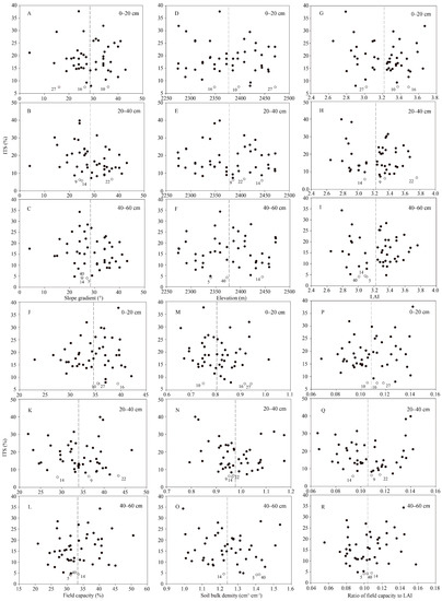 In order to further clarify the distribution characteristics of time-stable points characterized by ITS on our study hillslope, the relationship between ITS and topographic, vegetation, and soil factors for the soil layers of 0–20 cm, 20–40 cm, and 40–60 cm are shown in Figure 9, with the three points with the lowest ITS values labelled. As compared to the slope means, the slope gradient, elevation, LAI, field capacity, and soil bulk density of the three time-stable points, which can represent the mean VSM, fell in a broad range (Figure 10A–O), but the ratios of field capacity to LAI of these time-stable points were close to the slope means (Figure 10P–R).
