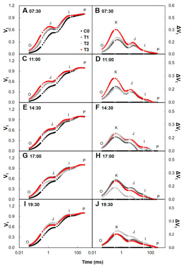 Comparison of Chlorophyll a fluorescence (OJIP) transients of control (C0, natural day/night cycle) and the day/night with artificial lighting cycle (T1, T2, and T3) after two years of artificial night lighting treatment. OJIP transients were induced by a 1 s light pulse of 3500 μmol·m−2·s−1. (A,C,E,G,I) Represent relative fluorescence kinetics (Vt) and (B,D,F,H,J) represent ΔVt (different kinetics of OJIP transients) among treatments at 07:30, 11:00, 14:30, 17:00 and 19:30, respectively. Vt at time t derived from the mean OJIP transients between FO and Fm, was defined as: Vt = (Ft − FO)/(FM − FO). ΔVt refer to differences of the Vt of all cases.