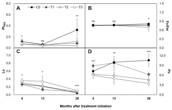Seasonal changes of photosynthetic function in yellow-poplar leaves treated with artificial night lighting. (A) Performance index (potential) for energy conservation from photons absorbed by PSII antenna to the reduction of QB (PIABS); (B) fluorescence-based maximum quantum yield of photosystem II photochemistry (Fv/Fm); (C) stomatal limitation to photosynthesis (LS = 1 − Ci/Ca); (D) photosynthetic rate (Pn, μmol·m−2·s−1) of yellow-poplar plants exposed to the natural day/night cycle (C0) and the day/night with artificial lighting cycle (T1, T2, and T3) during the experimental period. The black solid circles (●), gray solid circles (●), light gray solid circles (●), and hollow circles (○) represent C0, T1, T2, and T3, respectively. The x-axis represents the months after treatment initiation at 1 May 2013. Data points represent mean ± SD of five experimental replicates. Asterisks represent significant treatment effects at a single measuring date (* p < 0.05; ** p < 0.01; *** p < 0.001; ns, not significant).