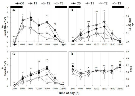 Diurnal patterns in leaf gas exchange parameters of yellow-poplar leaves during the 13-month treatment period. The dark period has a gas exchange rate by artificial night lighting. (A) Net photosynthetic rate (Pn), (B) stomatal conductance (Gs), (C) transpiration rate (Tr), and (D) ratio of intercellular (Ci) to atmospheric (Ca) CO2 concentration (Ci/Ca ratio) of yellow-poplar plants exposed to the natural day/night cycle (C0) and the day/night with artificial lighting cycle (T1, T2, and T3). The black solid circles (●), gray solid circles (●), light gray solid circles (●), and hollow circles (○) represent C0, T1, T2, and T3, respectively. Black and white boxes at the top indicate the dark and light phase, respectively, in the daily cycle. The x-axis represents the time of day (h). Data points represent mean ± SD (n = 5). Asterisks represent a significant difference among treatments (* p < 0.05; ** p < 0.01; *** p < 0.001; ns, not significant).