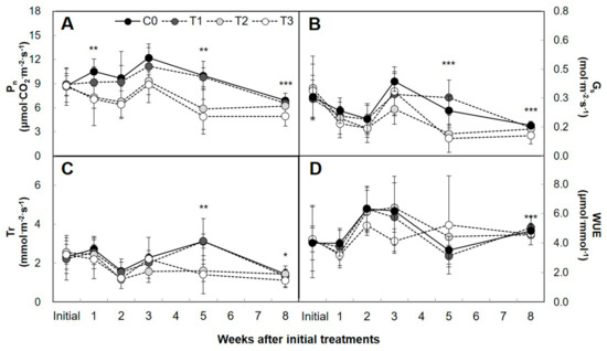 It was evident that Tr indicated statistically significant differences by 48% and 55% in T2 and T3, respectively (F3,16 = 6.720, p = 0.003), showing no statistically significant difference in T1 compared with that of control. After 8 weeks, Tr showed a statistically significant decrease by 23% in T3, starting from initial observation on 22 April 2014, but showed no statistically significant difference in T1 and T2 compared with that of control. The water use efficiency (WUE) in response to artificial night lighting showed a significant decrease by 23% in T3 compared with that of control after 8 weeks (F3,16 = 7.536, p < 0.001), although showing no statistically significant differences among treatments at 1, 2, 3, and 5 weeks (Figure 6D).