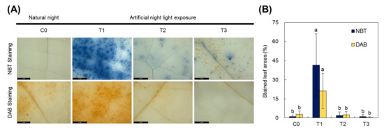 Yellow-poplar leaves were exposed to the natural day/night cycle and the day/night with artificial lighting cycle to detect histochemical quantification of ROS, especially O2− and H2O2 after NBT and DAB staining, respectively (Figure 7). Histochemical localization of O2− as formation of the blue formazan was higher in T1 compared with that of C0 or T2 and T3 (Figure 7A). Additionally, a diffuse blue staining was evident in T1. In contrast, a granular, particulate dark blue stain was present in T2 and T3 treatments. NBT staining also showed the highest O2− levels in the leaves grown under T1 treatment. At the stained area level (Figure 7B), O2− level expressed as a percentage of stained spot areas to the total leaf disc areas was 39-fold higher in T2 with artificial night lighting compared with that of C0 without artificial night lighting (F3,16 = 13.213, p < 0.001). Histochemical localization of H2O2, as indicated by the brown compounds formed by reaction with DAB, increased in leaf discs of T1 type-exposed plants (Figure 7A). Stained areas showed an approximately 7 times higher level in T1 than those of other treatments (Figure 7B). The stained area of H2O2 level showed significant increase in T1-treated plants compared to that of natural night type (C0), whereas T2 and T3 type of nighttime lighting were not statistically significant (F3,16 = 10.204, p = 0.001).