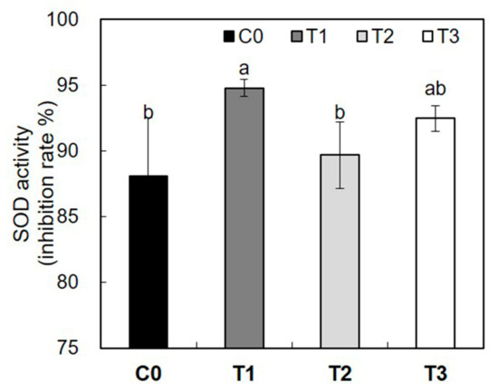 SOD (superoxide dismutase) activity in yellow-poplar leaves exposed to the natural day/night cycle (C0, black bar) and the day/night with artificial lighting cycle (T1, T2, and T3 denote dark gray bar, light gray bar, and white bar, respectively). Data indicate mean ± SD (n = 5). Different lowercase letters on the bars indicate significant differences among treatments (Tukey’s test after one-way ANOVA).