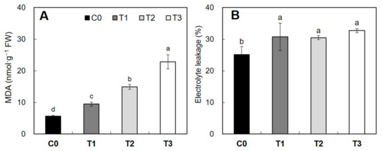 MDA (malondialdehyde) contents (A) and electrolyte leakage (B) in yellow-poplar leaves exposed to the natural day/night cycle (C0, black bars) and the day/night with artificial lighting cycle (T1, T2, and T3 denote dark gray bars, light gray bars, and white bars, respectively). Data indicate mean ± SD (n = 5). Different lowercase letters on the bars indicate significant differences among treatments (Tukey’s test after one-way ANOVA).