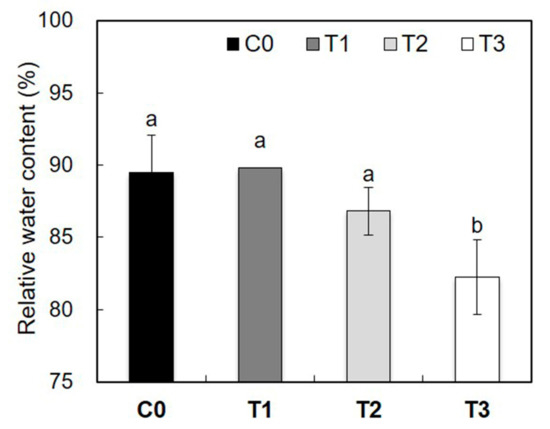 Relative water contents (RWC) in yellow-poplar leaves exposed to the natural day/night cycle (C0, black bar) and the day/night with artificial lighting cycle (T1, T2, and T3 denote dark gray bar, light gray bar, and white bar, respectively). Data indicate mean ± SD (n = 5). Different lowercase letters on the bars indicate significant differences among treatments (Tukey’s test after one-way ANOVA).