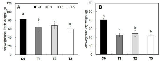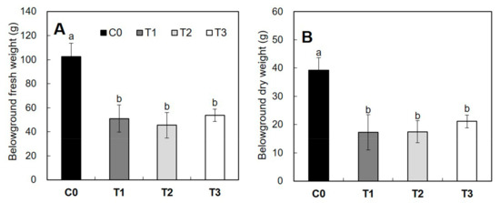 A similar trend was observed in belowground biomass of yellow-poplar seedlings after artificial night lighting (Figure 12). In an analysis of belowground biomass, a significant decrease of fresh and dry weight was noted in artificial night lighting with the HPS lamp. The belowground fresh weight was remarkably decreased by 50%, 56%, and 48% in T1, T2, and T3 compared with that of C0 (Figure 12; F3,16 = 36.248, p < 0.001). Furthermore, the belowground dry weight was significantly decreased by 56%, 55%, and 46% in T1, T2, and T3 compared with that of C0 (Figure 12B; F3,16 = 27.157, p < 0.001).