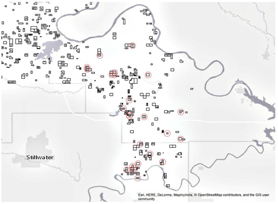 BIA-managed properties in this area of the Southern Plains region are outlined in black. The 25 properties randomly selected for field measurements in this study are circled in red.