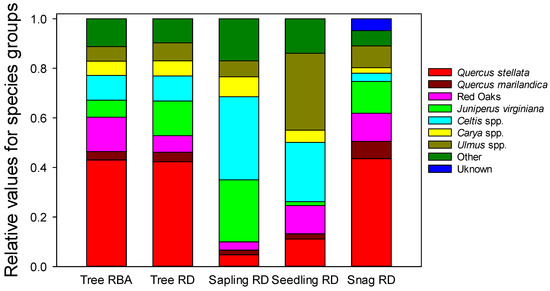 Tree relative dominance based on basal area (Tree RBA) as well as overstory tree, sapling, seedling, and snag relative density (RD) measured in Cross Timbers forests of north-central Oklahoma. Categories are either individual species or groupings of related species.