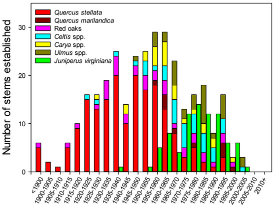 The species distribution for hardwood tree age reported in bi-decadal increments based on pith age at breast height was dominated by Q. stellata, particularly at older ages (Figure 4). The oldest tree sampled was a 233-year-old Q. stellata, which reached a height of 1.37 m between 1780 and 1785. The average Q. stellata sampled for age was 75 years old, with 83% of stems sampled between age 50 and 100 years. Quercus marilandica and Red Oaks, with a mean age of 63 and 73% stems between 40 and 90 years of age, were on average slightly younger than Q. stellata, but older than the more mesic species. The Cetlis spp., Ulmus spp., and Carya spp. stems were younger and began to reach the sapling size class after the 1950s with only six out of 92 stems sampled over 70 years of age. This group averaged 44 years of age, and 76% of stems sampled were between 20 and 60 years old. This parallels the results from the relative frequency data that seem to indicate recent and ongoing recruitment of the mesic species given their abundance in the sapling and seedling size classes. Measured at breast height, J. virginiania began to reach the sapling size class beginning in the 1950s.