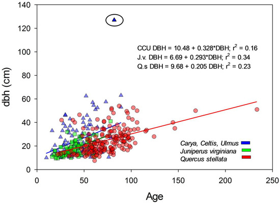 Relationship between age and dbh for Juniperus virginiana (J.v.), Quercus stellata (Q.s.), and a combined Mesic group of Carya spp., Celtis spp., and Ulmus spp. (CCU). All ages were taken at dbh and not adjusted. The circled outlier for the mesic species grouping was removed for calculation of relationship between age and dbh.