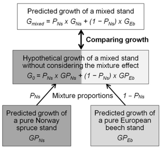 Two stand basal area increment models (Figure 1) were constructed using the fixed effects of the best growth models described in Section 2.3: Gmixed, the predicted growth of a mixed stand and G0, the predicted growth of a mixed stand under the null hypothesis (i.e., considering that no mixing effects occur). G0 was the sum of the predicted growth of pure stands (in the selected growth models, the proportions were set to 1) which were weighted by their share in the hypothetical mixed stand (PNs and 1 − PNs for Norway spruce and European beech, respectively). Gmixed was obtained by adding the predicted growth of both species in mixed stands (in the growth models, the proportions were set to PNs for Norway spruce and 1 − PNs for European beech) which were weighted by their share in the mixture PNs and 1 − PNs. For given species proportions, Gmixed − G0 > 0 indicate that the growth of the mixed stand exceeds the growth of pure stands (i.e., overyielding). The reverse situation implies underyielding. Transgressive overyielding can occur when Gmixed > GPNs and Gmixed > GPEb, i.e., the mixed stand is even more productive than a pure stand of the most productive species [15].