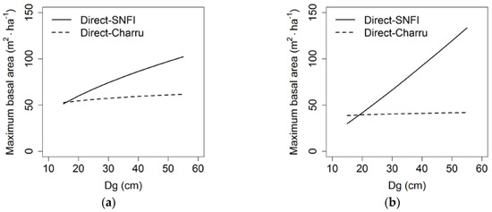 Maximum basal area over quadratic mean diameter derived using two Direct alternatives: (a) for Norway spruce; (b) for European beech. The “SNFI” parameters were estimated using data of the Swiss National Forest Inventory (SNFI). The “Charru” parameters stem from Charru et al. [43]. Dg: quadratic mean diameter (cm).