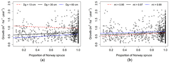Both species’ growth was influenced by species proportions. The growth of Norway spruce increased the higher its own proportions in the stand, i.e., Norway spruce grew better in pure stands than in mixed stands. A significant interaction between the quadratic mean diameter (Dg) and species proportion was found. The slope of the regression line (Figure 3a) was negative (i.e., positive mixing effect) for stands with small Dg (i.e., young stands) whereas the mixing effect was found to be positive and increasing with higher Dg. We also found a significant interaction between species proportions and the moisture index (mi). The negative mixing effect (positive slopes) decreased slightly as the moisture index increased (Figure 3b), meaning that the negative mixing effect was lower at wet sites than at dry sites.