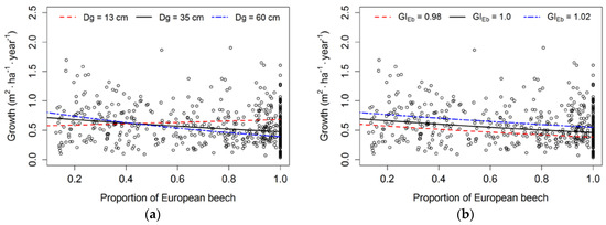 The growth of European beech decreased when its own proportions increased, denoting positive mixing effects on the growth of this species. As for Norway spruce, we found a significant interaction between the proportions and Dg, but in opposite directions. The mixture had a slight negative effect (positive slope) on the growth of European beech in young stands while the mixing effect was positive and increased as Dg increased (Figure 4a). Additionally, we found a significant interaction between species proportions and the growth index GI. The slope of the regression line (Figure 4b) was negative and slightly increased with increasing GI; this means that positive mixing effects were higher for stands with higher site quality.