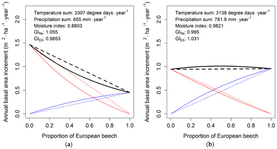 Basal area increment of two NFI sites using 3P proportions: (a) the site showing the lowest underyielding for 50%–50% proportions; and (b) a site showing a transgressive overyielding. The basal area increment was predicted for Dg = 35 cm, sd = 0.65 and the ecological conditions indicated on the respective graphs for European beech (blue), Norway spruce (red) and the total stand (black). Underyielding (or overyielding) is the negative (or positive) difference between the predicted basal area increment in mixture (continuous line) and the expected increment under the assumption of no mixing effects (dashed line). GINs: growth index for Norway spruce.