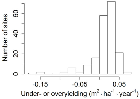 Predicted under- or over-yielding for the 192 NFI mixed sites using 50%–50% 3P proportions.