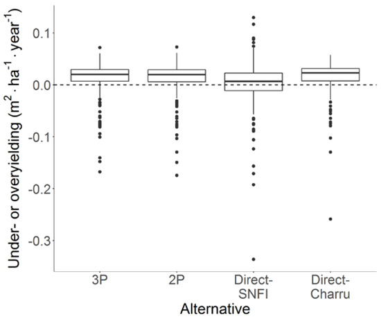 Boxplots of predicted under- or over-yielding for 50%–50% proportions on the 192 NFI mixed sites using different alternatives to define the species proportion (3P, 2P, Direct-SNFI, and Direct-Charru). 3P: 3-parameter extended competition density rule; 2P: 2-parameter extended competition density rule; Direct-SNFI: BAmax is calculated directly using STR coefficients derived with SNFI data; Direct-Charru: BAmax is calculated directly using STR coefficients by Charru et al. [43].