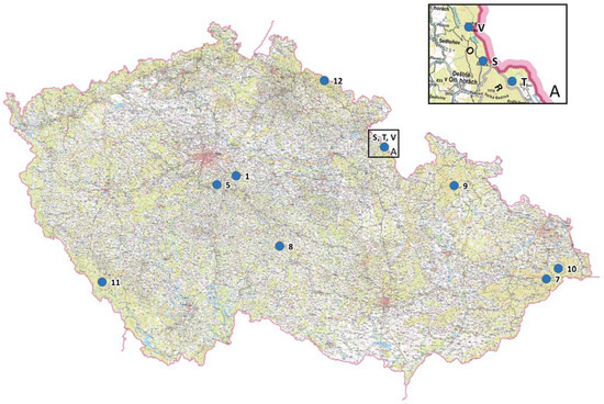 Eight Czech Norway spruce populations and nine subpopulations from the Orlické hory population (a total of 17 units) were genetically screened by nuclear microsatellites. Sampling of young needles was carried out during 2012–2016 from individual trees growing in gene conservation units, national parks, a protected landscape area, and national nature reserves. A more detailed investigation was carried out in the Orlické hory locality, where genetic parameters were studied within nine subpopulations of one gene conservation unit (GZ 102 Trčkov–Šerlišský kotel–Vrchmezí) and compared to the other populations. The locality designations, geographic coordinates, altitudes, and natural origins are presented in Table 1, sampling locations in Figure 1, and mean sample size of studied units was 34.7. The distance between randomly-sampled adult trees was approximately 80–100 m within gene conservation units in different parts of the Czech Republic, and 25–30 m within nine subpopulations of one gene conservation unit (GZ 102 Trčkov–Šerlišský kotel–Vrchmezí). Investigated Norway spruce populations or subpopulations represent three main different ecotypes (Table 1).